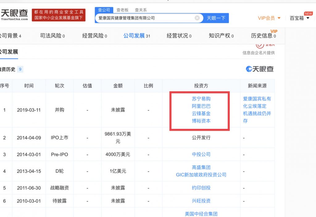 阿里、苏宁易购等完成并购健康体检公司爱康国宾